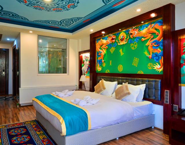 The hotel boasts a range of well-appointed rooms and suites, each meticulously designed to provide a comfortable and cosy atmosphere. The interiors are adorned with traditional artwork and furnishings, creating a harmonious blend of modern amenities and local charm.